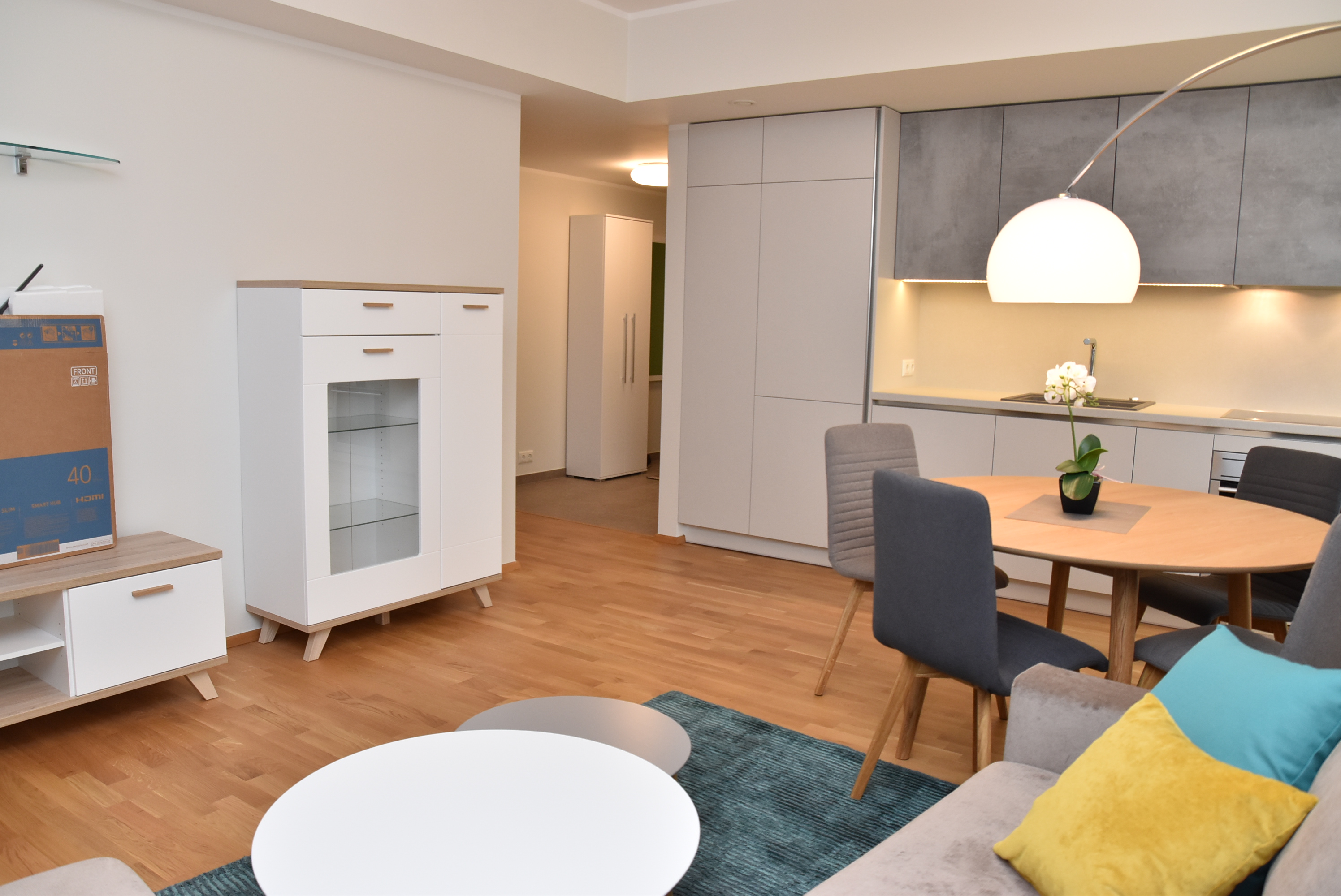 Korter ja sisustus on uueväärne. Kogenud sisekujundaja abil on saavutatud stiilne ja hubane elamine. Kõik piltidel olev mööbel ja kodutehnika jääb korterisse. Väiksema toa mööbel valitakse uue üürniku soove arvestades. Vannitoas oleval pesumasinal on ka kuivati funktsioon. Köögis on<